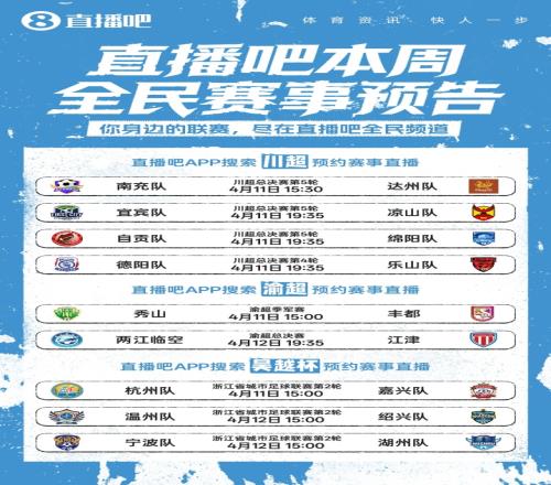 周末看球不迷路!川超渝超吳越杯開戰(zhàn)直播吧全民頻道全程直播