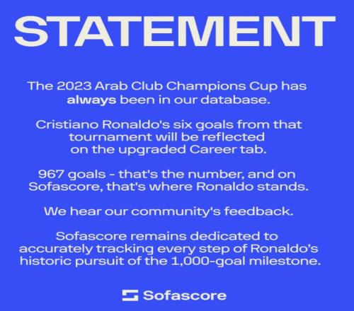 球迷反饋稱sofascore找不到C羅阿拉冠的進(jìn)球,如今sofascore如今發(fā)布公告做出回應(yīng)。