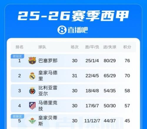 西甲第31輪,皇馬主場(chǎng)1-1戰(zhàn)平赫羅納??纯醋钚路e分榜的情況。