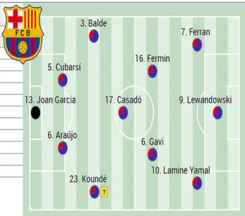 中場區(qū)域,卡薩多可能回歸防守型后腰位置,加維進入首發(fā)陣容,費爾明出任進攻型中場,讓佩德里、奧爾莫獲得休息,德容則可能在下半場替補出場。