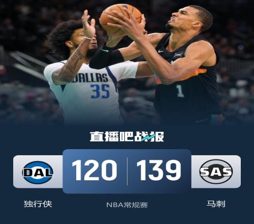 開場后馬刺多點開花早早建立領先,弗拉格站出來為獨行俠止血并且縮小分差,馬刺則依靠整體的發(fā)揮保持領先,并在首節(jié)尾聲將分差拉大到兩位數(shù)。第二節(jié)上來弗拉格延續(xù)火熱狀態(tài)繼續(xù)砍分,文班亞馬毫不示弱也強勢回應,第二節(jié)尾聲獨行俠外線突然爆發(fā)連續(xù)命中三分一度將比分反超,文班亞馬站出來連續(xù)強攻穩(wěn)住局面,半場過后馬刺保有3分優(yōu)勢。易邊再戰(zhàn),文班亞馬在內線依舊統(tǒng)治力十足,不過獨行俠也是手感火熱繼續(xù)緊咬比分,進入輪換時間后福克斯開始發(fā)力幫助馬刺再度建立起兩位數(shù)優(yōu)勢。最后一節(jié)馬刺上來就將分差拉大到20分以上,獨行俠也無力追分,最終馬刺139-120戰(zhàn)勝獨行俠取得3連勝,獨行俠遭遇3連敗。