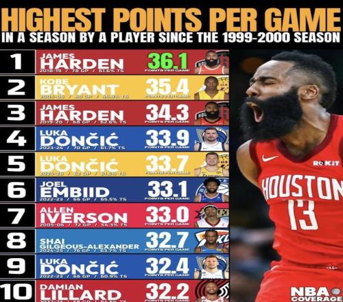 自1999-00賽季以來(lái)球員單賽季場(chǎng)均得分前十