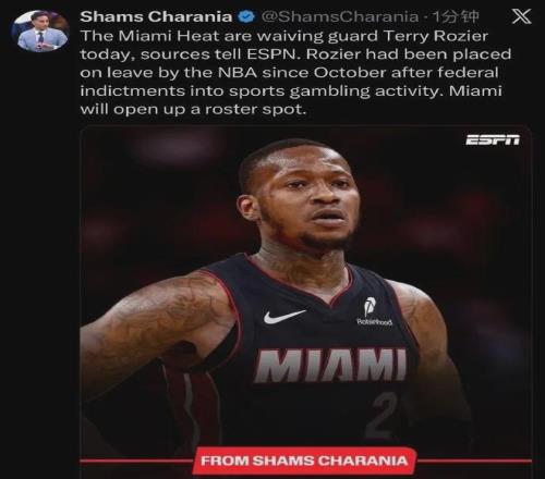 爆料王Shams:熱火裁掉深陷賭球風(fēng)波的后衛(wèi)特里-羅齊爾。