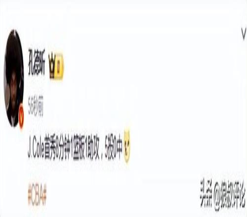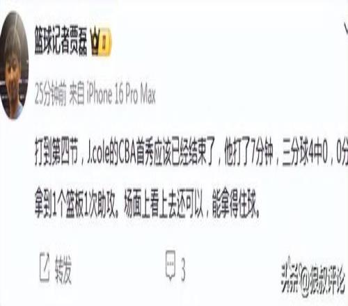 籃球記者賈磊發(fā)文點評說道:打到第四節(jié),J.cole的CBA首秀應(yīng)該已經(jīng)結(jié)束了,他打了7分鐘,三分球4中0,0分拿到1個籃板1次助攻。場面上看上去還可以,能拿得住球。