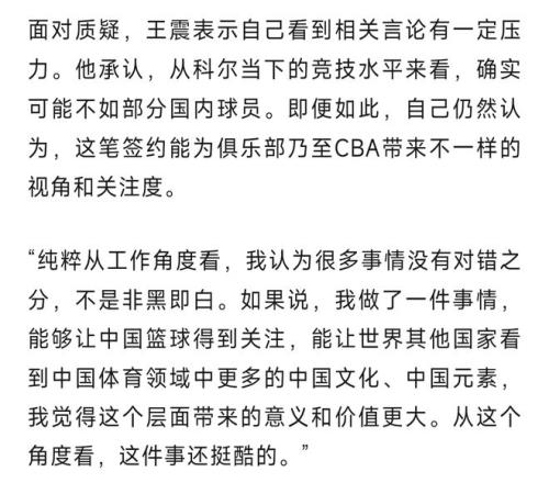 王震表示他承認(rèn)J.Cole當(dāng)下的競技水平確實不如職業(yè)球員,但即便如此,這筆簽約能為俱樂部乃至CBA帶來不一樣的關(guān)注度。