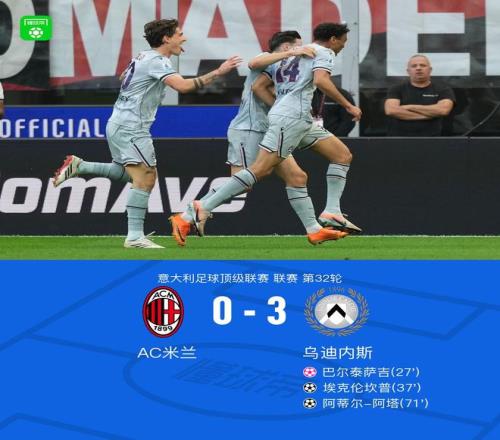 北京時(shí)間4月12日意大利足球甲級(jí)聯(lián)賽第32輪,AC米蘭主場(chǎng)迎戰(zhàn)烏迪內(nèi)斯。上半場(chǎng)扎尼奧洛分球,阿塔射門(mén)造巴爾泰薩吉烏龍,之后扎尼奧洛傳中,埃克倫坎普頭球破門(mén)。下半場(chǎng)??藗惪财諅髑?,阿塔低射將球打進(jìn)死角。最終米蘭0-3不敵烏迪內(nèi)斯。