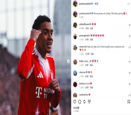 穆西亞拉也在賽后通過社媒曬出自己的比賽照,并配文:“今天在客場(chǎng)取得大勝,我們會(huì)繼續(xù)前進(jìn)。”