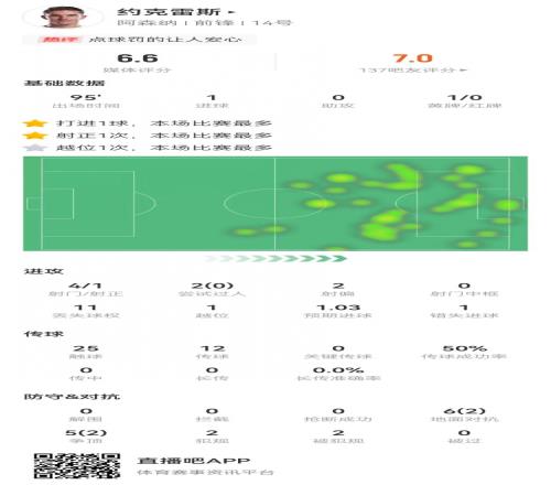 約克雷斯本場4射1正進(jìn)1球+1失良機(jī)11對抗4成功+2造犯規(guī)獲6.6分