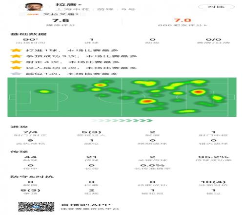 拉唐全場(chǎng)數(shù)據(jù):7射門(mén)4射正2關(guān)鍵傳球+95%傳球成功率,獲評(píng)7.6分