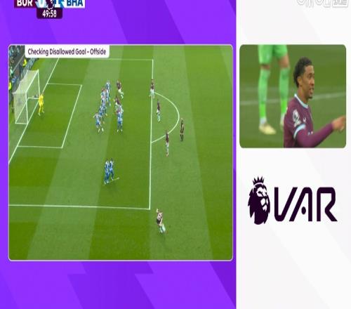伯恩利攻入一球,邊裁舉旗示意越位VAR復核后確認越位