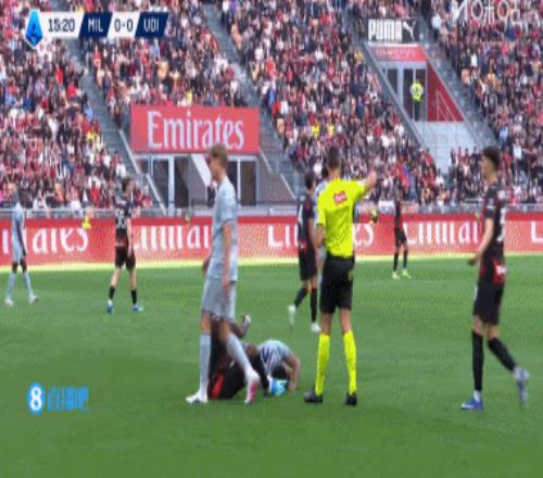 體育播報(bào)04月12日宣 米蘭vs烏迪內(nèi)斯第16分鐘,萊奧推進(jìn)時(shí)對(duì)抗倒地被吹進(jìn)攻犯規(guī),他坐地面帶笑容,對(duì)裁判鼓掌,他被出示黃牌。