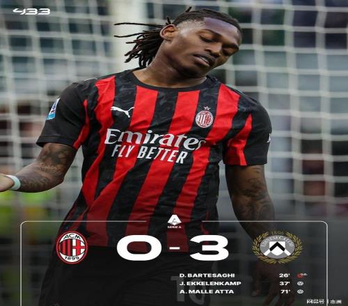意甲第32輪,AC米蘭客場0-3不敵烏迪內(nèi)斯,遭遇兩連敗,先賽情況下積63分依舊排在第三。阿塔小角度爆射造成巴爾泰薩吉烏龍,??死湛奉^球擴(kuò)大比分,薩勒馬科爾斯遠(yuǎn)射被撲后擊中橫梁,阿塔鎖定勝局。