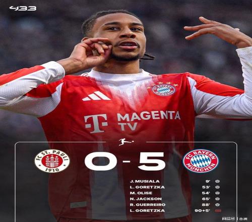 德甲第29輪,拜仁客場5-0圣保利,本賽季打進(jìn)105球,打破隊(duì)史聯(lián)賽單賽季進(jìn)球紀(jì)錄,各項(xiàng)賽事五連勝,12分優(yōu)勢領(lǐng)跑積分榜,若下輪自己取勝而多特丟分,則提前奪冠。穆西亞拉頭球破門,格雷茨卡、奧利塞再下一城,杰克遜建功,格雷羅鎖定勝局。