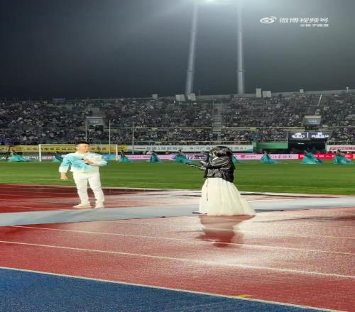 蘇超首輪賽前,尚雯婕與湯非獻唱揚州隊隊歌《馬上成功》
