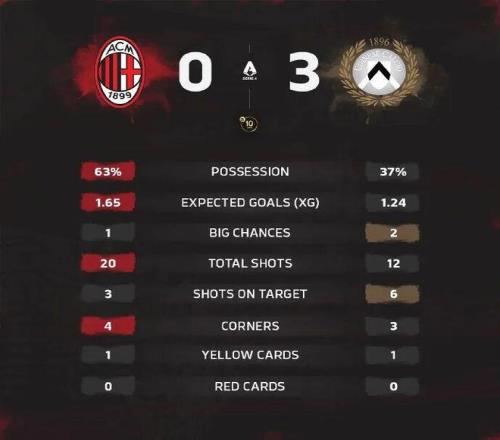 全場比賽結(jié)束,米蘭0-3烏迪內(nèi)斯。