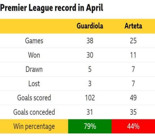 這樣推測(cè)走勢(shì)是不是更合理?但別忘了推算都不能當(dāng)成現(xiàn)實(shí),具體情況還得繼續(xù)觀望。只能說(shuō)形勢(shì)對(duì)槍手而言確實(shí)非常兇險(xiǎn),無(wú)論是看當(dāng)下狀態(tài)還是歷史經(jīng)驗(yàn)。本賽季之前,4月就是阿爾特塔帶隊(duì)英超成績(jī)最差的月份,勝率僅為44%,而瓜迪奧拉偏偏又最會(huì)在這個(gè)月份搶分,歷年來(lái)英超4月帶隊(duì)勝率高達(dá)79%。如果這種“最弱”對(duì)“最強(qiáng)”的情況再次重演,那等不了多久,槍手就得說(shuō)“來(lái)年再戰(zhàn)”了。
