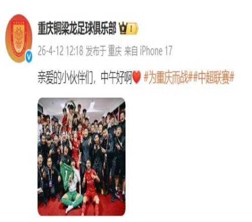5輪不敗暫登頂中超!重慶銅梁龍官方分享全隊(duì)合影慶祝取勝