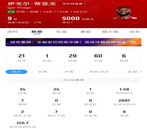 2024年夏窗布倫特福德以3300萬歐元的轉會費,從布魯日簽下伊戈爾·蒂亞戈,本賽季他代表球隊出戰(zhàn)34場比賽,貢獻24粒進球和1次助攻,幫助球隊在32輪過后排名英超第7,僅落后歐聯(lián)區(qū)1分。
