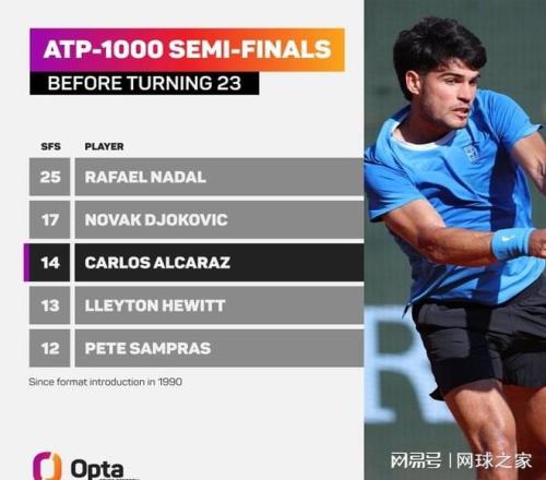 阿爾卡拉斯另一項了不起的新成就是,成為在23歲之前14次打進大師賽四強第三人,僅次于納達爾(25)和德約(17),超過了休伊特(13)和桑普拉斯(12)。