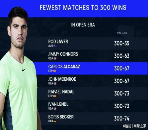 這場送蛋布勃利克的勝利,讓阿爾卡拉斯成為所用場次第三少達成職業(yè)生涯300場單打勝利的男子球員。西班牙人以300勝67負同麥肯羅并列排在第三位,僅次于以300勝55負排在第一位的拉沃爾和以300勝63負位居第二位的康納斯,躍在了同為300勝73負的倫德爾和納達爾以及300勝74負的倫德爾前面。