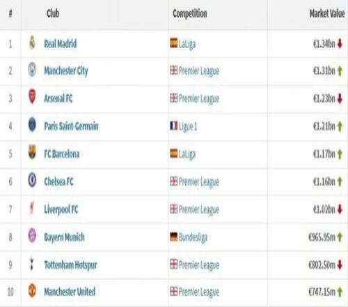 附歐洲身價(jià)前十俱樂部(單位:歐元):