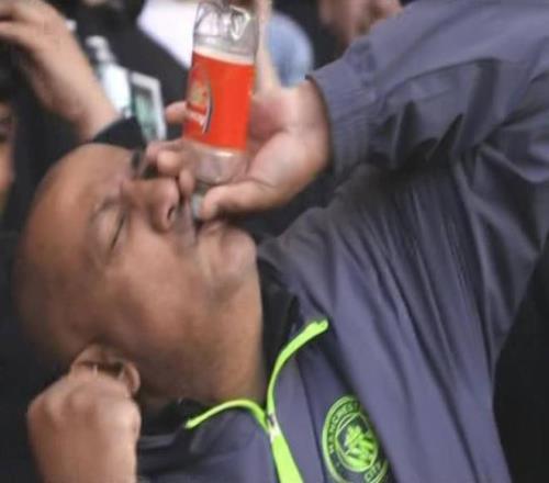 阿森納就這水瓶曼城球迷手握阿森納隊徽瓶子“對瓶吹”