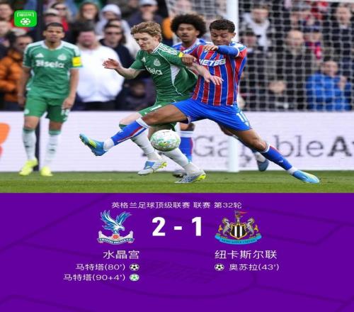 北京時(shí)間4月12日英格蘭足球頂級(jí)聯(lián)賽 聯(lián)賽 第32輪,水晶宮主場對(duì)陣紐卡斯?fàn)柭?lián)。水晶宮馬特塔梅開二度。紐卡斯?fàn)柭?lián)奧蘇拉破門。最終比分水晶宮 2-1 紐卡斯?fàn)柭?lián)。
