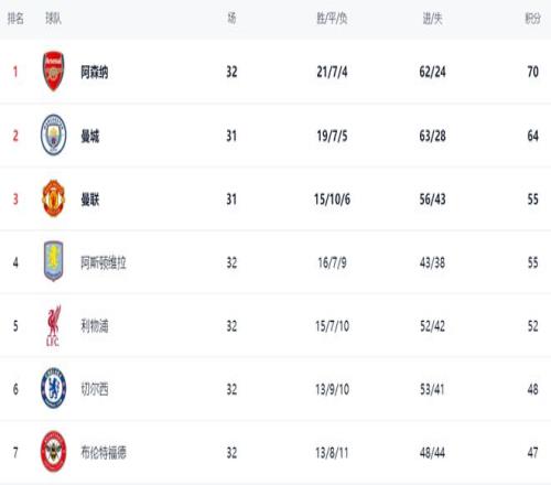 在積分榜上,阿森納21勝7平4負(fù),拿到70分,排名榜首。曼城贏球之后,縮小了與阿森納的差距。曼城64分,排名第2,在少賽一場的情況下落后阿森納6分。曼聯(lián)55分排名第3。阿斯頓維拉也是55分,排名第4。利物浦52分,排名第5。輸球的切爾西依然是48分,排名第6。熱刺只拿到30分,排名第18,深陷降級區(qū)。
