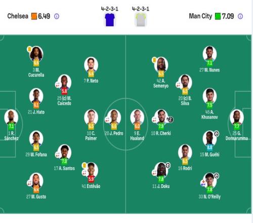 切爾西首發(fā):1-桑切斯、3-庫庫雷利亞、21-哈托、27-古斯托(88’34-喬什·阿昌龐)、29-福法納、17-桑托斯(67’45-拉維亞)、25-凱塞多(81’14-埃蘇戈)、7-內(nèi)托、10-帕爾默、41-埃斯特旺(67’49-加納喬)、20-若昂·佩德羅(81’9-德拉普)。
