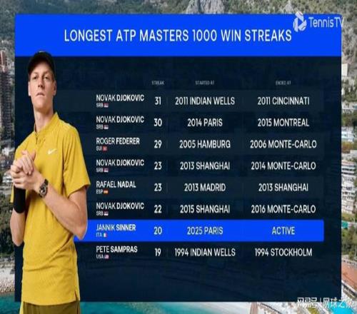 在2-0淘汰阿利亞西姆、取得對陣對手的五連勝之后,辛納成為了歷史上第四位能夠取得ATP大師賽20連勝的男子單打選手,在他前面都有哪些人?他有望打破紀錄嗎?