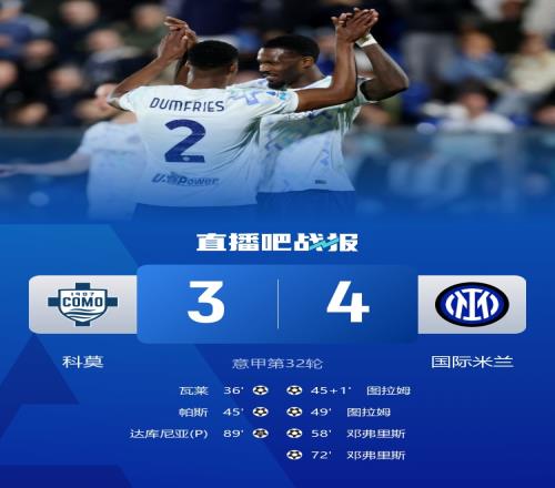 體育播報(bào)4月13日宣 意甲第32輪,科莫坐鎮(zhèn)主場(chǎng)朱塞普希尼加格利亞球場(chǎng)迎戰(zhàn)國(guó)際米蘭。上半場(chǎng),帕斯、瓦萊進(jìn)球,小圖拉姆建功。易邊再戰(zhàn),圖拉姆精彩挑射完成雙響,鄧弗里斯也是梅開(kāi)二度,博尼送點(diǎn),達(dá)庫(kù)尼亞點(diǎn)射。最終國(guó)米4-3科莫。積分榜方面,國(guó)米75分以9分優(yōu)勢(shì)領(lǐng)跑,科莫58分第五。