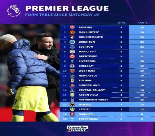 德轉統(tǒng)計了同期(自第19輪以來)英超各隊的積分情況,熱刺是唯一沒有取勝過的球隊,而且球隊同期積分排在英超20支球隊的最后一位。