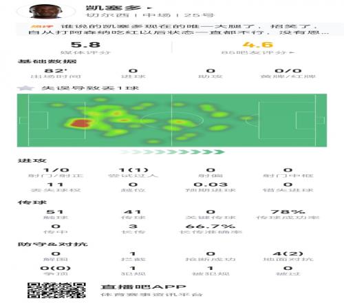 技術統(tǒng)計數據顯示,凱塞多本場比賽1射零正,1次成功過人,無關鍵傳球,4次地面對抗成功兩次,僅獲評5.8分。