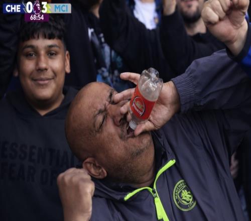 體育播報(bào)04月13日宣 本輪英超,曼城3-0完勝切爾西,在追趕阿森納的路上拿下一場(chǎng)大戰(zhàn)。比賽第69分鐘,鏡頭給到了一個(gè)拿著印有阿森納瓶子的老哥,盡情地嘲諷慶祝。