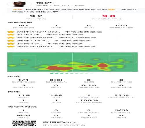 賽后技術(shù)統(tǒng)計數(shù)據(jù)顯示,格伊本場比賽1射1正,1次關(guān)鍵傳球,1次解圍,3次攔截,3次搶斷,5次地面對抗全部成功,4次爭頂成功3次,獲評9.2分。