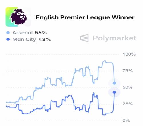 近乎五五開(kāi)!英超奪冠概率:阿森納從91%暴跌至56%,曼城升至43%
