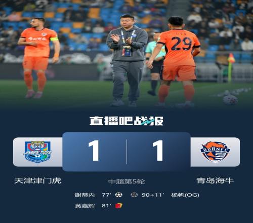 體育播報4月12日宣 北京時間19:00,中超第5輪天津津門虎vs青島海牛,比賽在天津泰達足球場打響!上半場,埃朱馬中柱,黃嘉輝、金永浩、羅森文、吳興涵4人染黃。下半場,謝蒂內替補登場破門,黃嘉輝染紅,金永浩被鏟傷退!楊帆101分鐘自擺烏龍!最終,天津津門虎1-1戰(zhàn)平青島海牛,仍無緣新賽季首勝!津門虎-8分仍墊底,海牛-3分排名倒數第二。