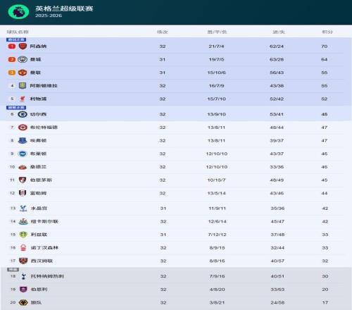 阿森納在32輪聯(lián)賽過后,戰(zhàn)績是21勝7平4負(fù),積70分,排名聯(lián)賽第一。他們一共打入了62個(gè)進(jìn)球,丟了24個(gè)球,凈勝球是38個(gè)。