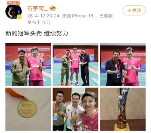 生涯首奪亞錦賽!石宇奇社媒曬獎杯獎牌:新的冠軍頭銜,繼續(xù)努力