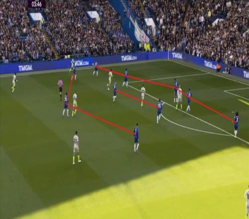 所以,怎么著可能都不行,但至少在今天,體現(xiàn)出來的問題就是帕爾默不能在中場中路防守,尤其是在上半場末段,隨著奧賴?yán)麕е戆宓暮蟛迳祥_始上線,切爾西在這一側(cè)承受的壓力就更大了: