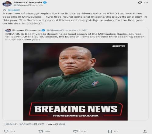 北京時(shí)間4月13日,NBA常規(guī)賽:雄鹿106-126不敵76人,最終以32勝50負(fù)結(jié)束本賽季征程。比賽剛結(jié)束,NBA名記Shams報(bào)道,雄鹿和主教練道格-里弗斯分道揚(yáng)鑣。里弗斯在雄鹿執(zhí)教兩年半,常規(guī)賽戰(zhàn)績(jī)97勝102負(fù),勝率48.7%。