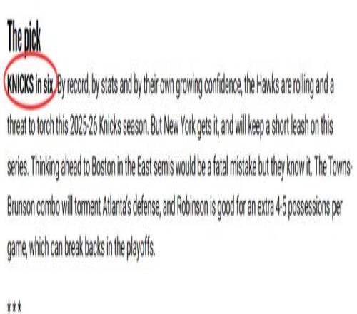 北京時(shí)間4月13日,尼克斯確定首輪對(duì)陣?yán)销?,并擁有主場?yōu)勢(shì)。NBA官網(wǎng)對(duì)這輪系列賽展開前瞻,并預(yù)測(cè)尼克斯最終4-2淘汰老鷹,晉級(jí)東部半決賽。以下是相關(guān)內(nèi)容——