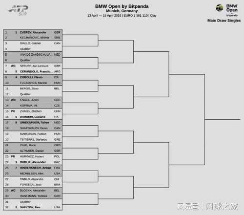 ATP500慕尼黑站:小茲維列夫、謝爾頓、布勃里克、科博利作為前四號(hào)種子領(lǐng)銜。中國(guó)球員張之臻出戰(zhàn),首輪對(duì)陣6號(hào)種子達(dá)爾德里。