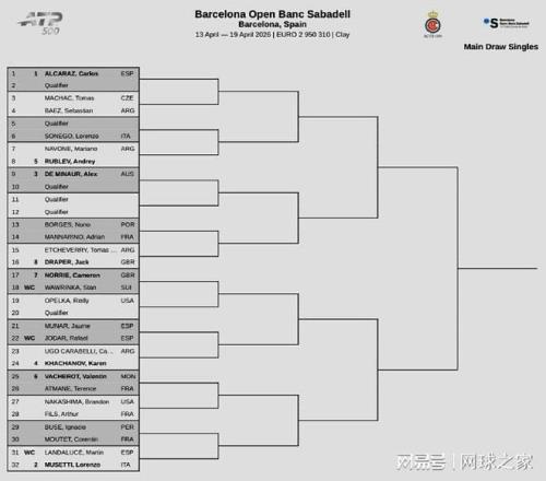 我們?cè)賮?lái)關(guān)注下周賽事。北京時(shí)間昨晚,下周的四站巡回賽相繼公布了正賽簽表。ATP500巴塞羅那站:阿爾卡拉斯、穆塞蒂、德米納爾、卡恰諾夫作為前四號(hào)種子出戰(zhàn)。前八大種子對(duì)位:阿爾卡拉斯--盧布列夫、德米納爾--德雷珀、諾里--卡恰諾夫、瓦舍羅--穆塞蒂。