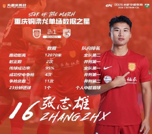 打入個(gè)人中超首球,張志雄當(dāng)選重慶銅梁龍本輪隊(duì)內(nèi)數(shù)據(jù)之星