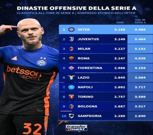 體育播報4月13日宣 德國轉(zhuǎn)會市場統(tǒng)計(jì)了各隊(duì)在意甲的歷史進(jìn)球總數(shù)量,并列出榜單,國米打進(jìn)5465球,超越尤文居首。