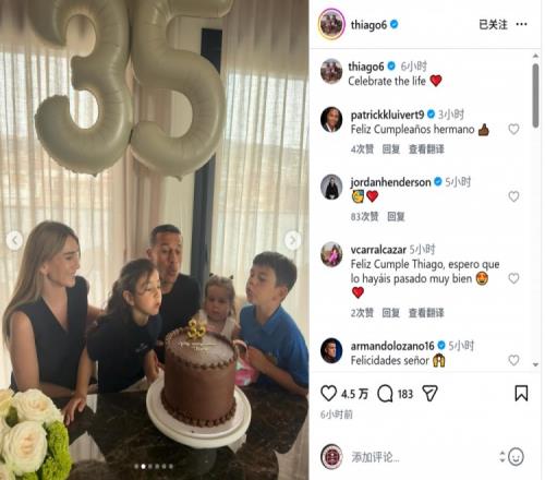 蒂亞戈迎來35歲生日,社媒曬與家人一起慶生照片