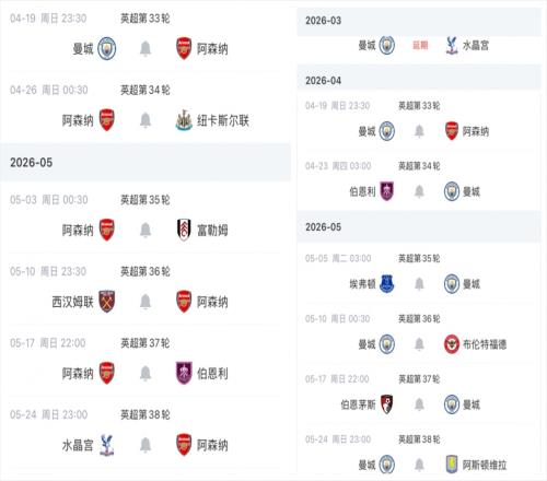曼城少賽1場(chǎng)距榜首阿森納6分,兩隊(duì)還有一場(chǎng)天王山之戰(zhàn)下輪打響。兩隊(duì)賽程對(duì)比如上圖。