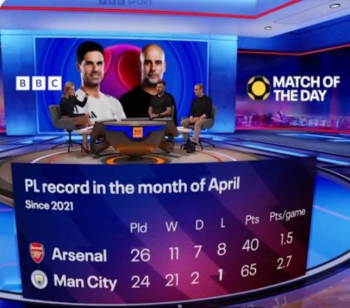 體育播報(bào)4月13日宣 BBC統(tǒng)計(jì)了2021年以來4月份沖刺階段阿森納、曼城在英超比賽中的戰(zhàn)績,阿森納場(chǎng)均1.5分、曼城場(chǎng)均2.7分。