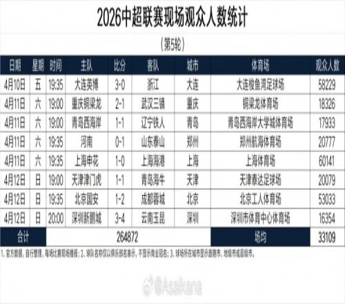 體育播報4月13日宣 2026賽季中超聯(lián)賽第五輪戰(zhàn)罷,據(jù)《轉會市場》中國區(qū)管理員朱藝統(tǒng)計,本輪中超現(xiàn)場觀眾總人數(shù)264872人,排名中超歷史單輪現(xiàn)場觀眾總人數(shù)第3位。